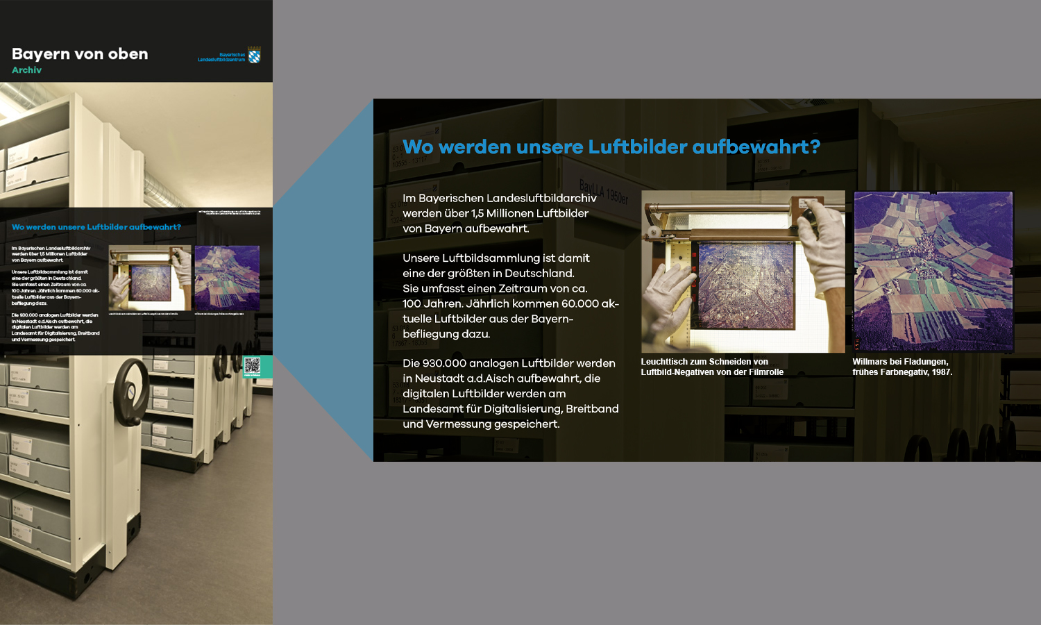 Anlässlich des fünfjährigen Bestehens des Bayerischen Landesluftbildzentrums stellte die Wanderausstellung dessen Angebote einem breiten Publikum vor. Die multimedial gestaltete und leicht verständlich aufbereitete Ausstellung vermittelt einen spannenden Einblick in die Geschichte und Technik der Luftbildfotografie. Auf 14 Ausstellungstafeln wurde den Besucherinnen und Besuchern gezeigt, wie Luftbilder gemacht werden, wie sie aufbereitet werden und wo sie eingesetzt werden.